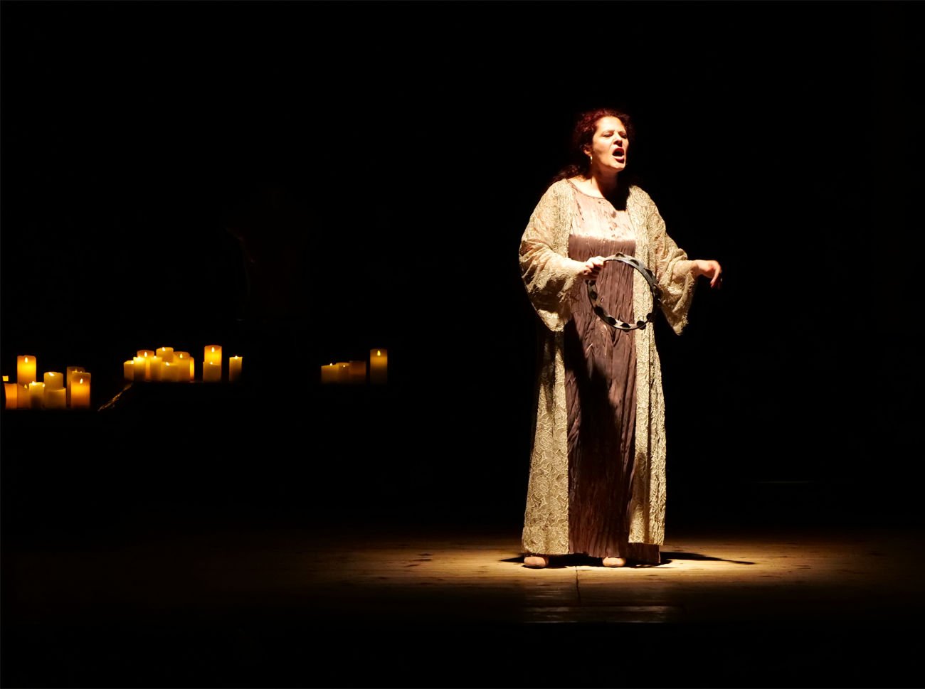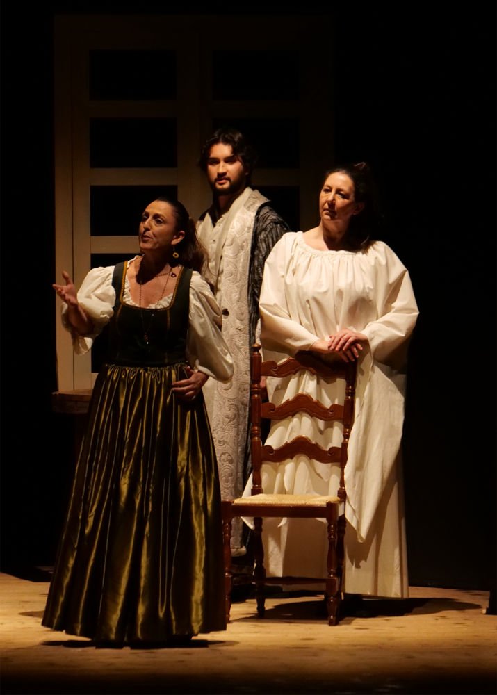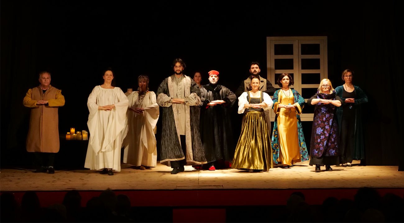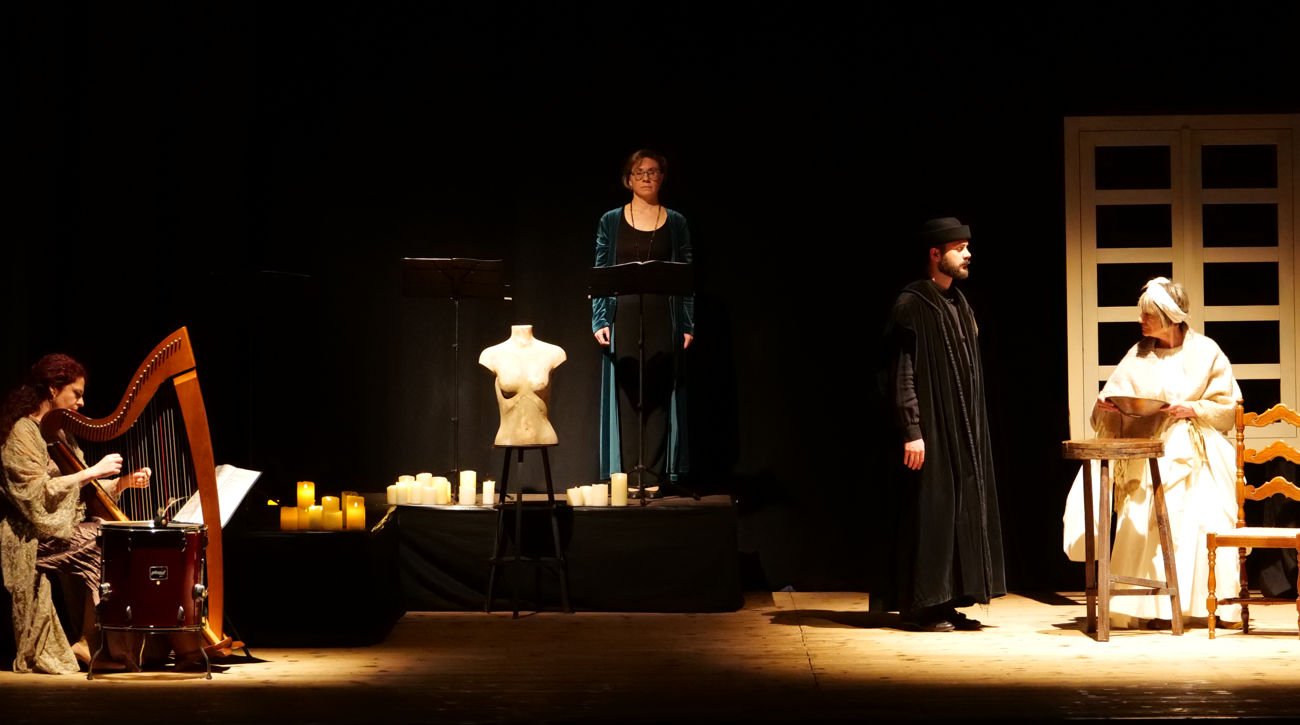 La scena contrappone l’oggi, sul praticabile dei lettori, al passato, che degli attori rievocano sul palcoscenico; li unisce la presenza di una musicista- narratrice immersa nella luce senza tempo delle candele. Secondo i dettami del teatro elisabettiano, coevo rispetto alla vicenda, l’allestimento affida alla luce, ai costumi d’epoca, ai pochi arredi ed oggetti simbolici, la rievocazione di atmosfere a volte inquietanti o drammatiche, altre volte distese.