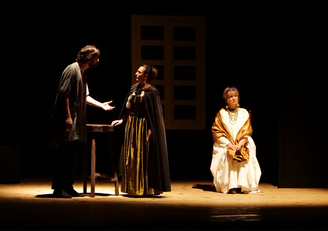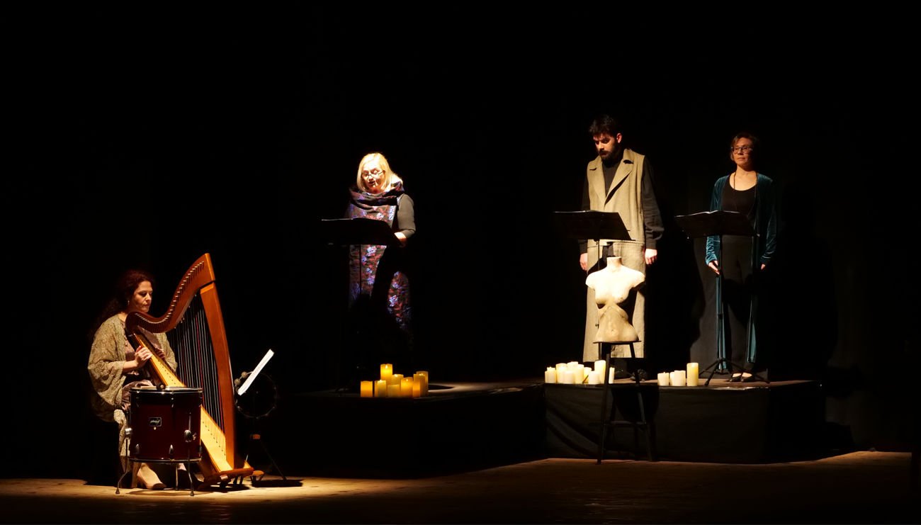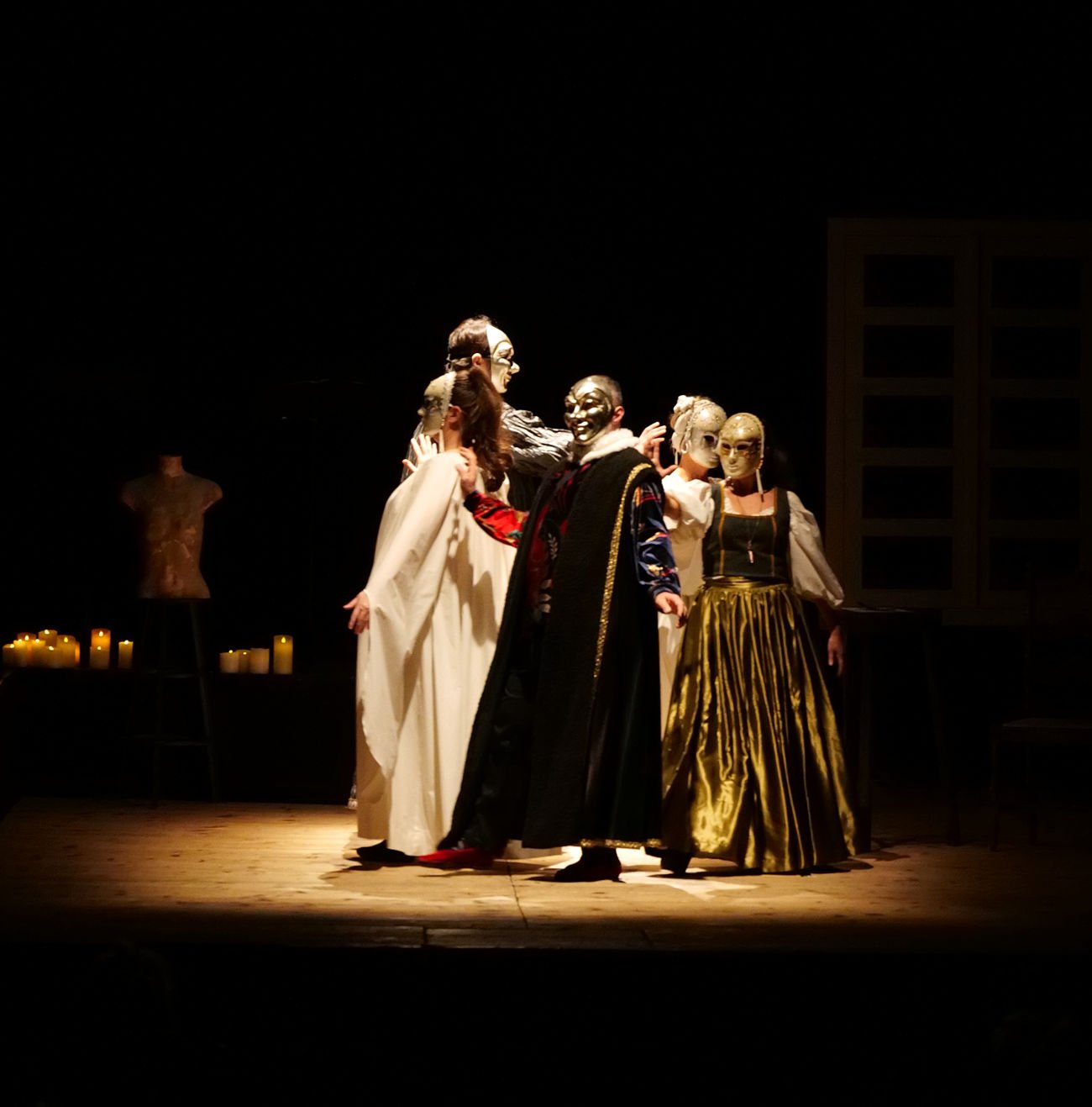 La scena contrappone l’oggi, sul praticabile dei lettori, al passato, che degli attori rievocano sul palcoscenico; li unisce la presenza di una musicista- narratrice immersa nella luce senza tempo delle candele. Secondo i dettami del teatro elisabettiano, coevo rispetto alla vicenda, l’allestimento affida alla luce, ai costumi d’epoca, ai pochi arredi ed oggetti simbolici, la rievocazione di atmosfere a volte inquietanti o drammatiche, altre volte distese.